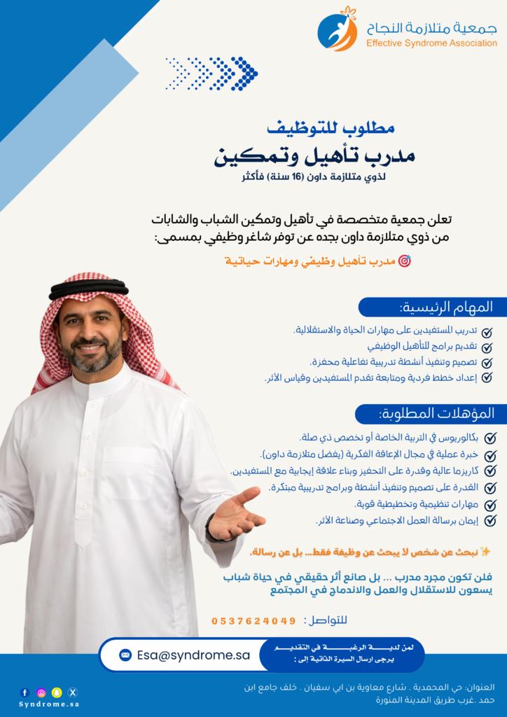📢 فرصة وظيفية | مدرب تأهيل وتمكين لذوي متلازمة داون (16 سنة فأكثر)