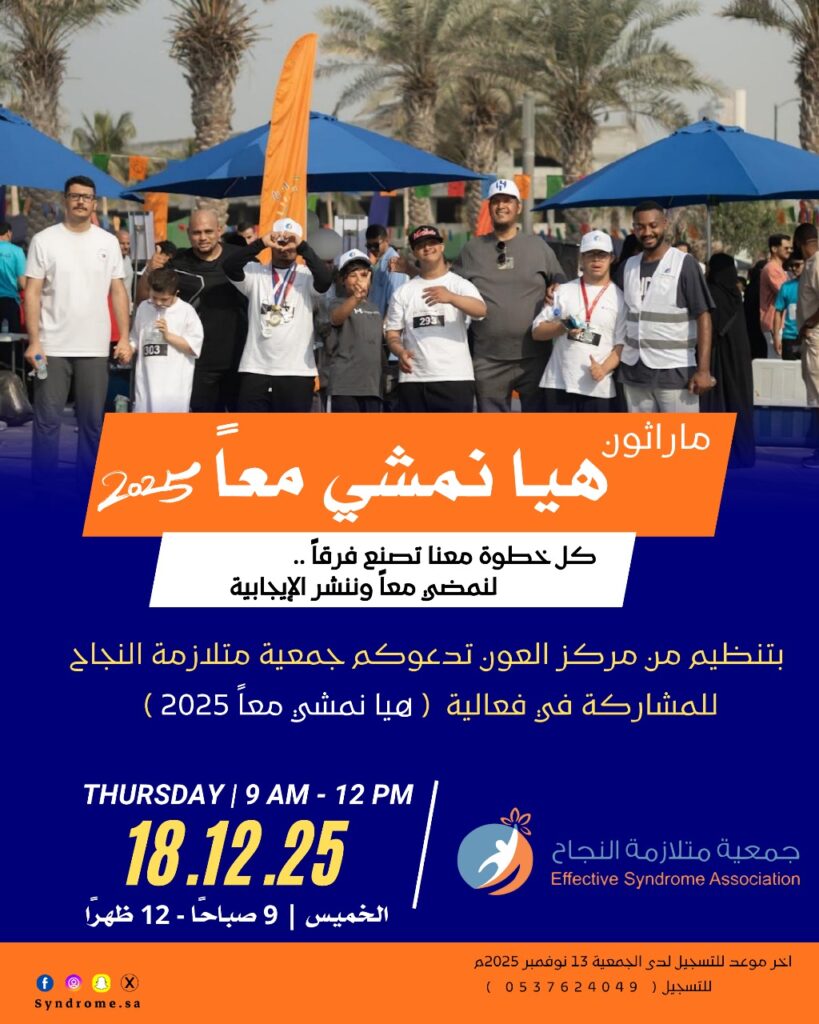 ( كل خطوة معنا تصنع فرقاً .. لنمضي معاً وننشر الإيجابية ) بتنظيم من مركز العون تدعوكم جمعية متلازمة النجاح للمشاركة في فعالية ( هيا نمشي معاً 2025 ) […]